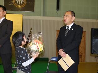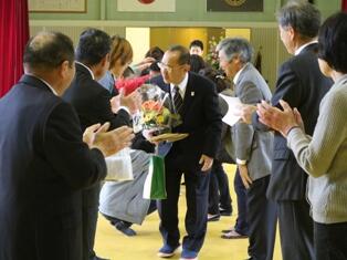 の後、花や寄せ書き等のプレゼントを贈り、校歌を斉唱し