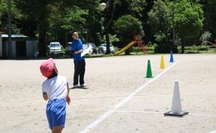 ソフトボール投げの記録を測定しました。体力テストも残すところあと1種