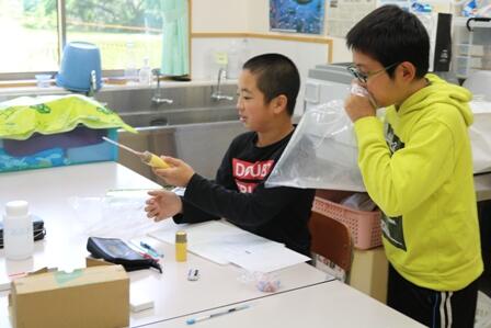 酸素・二酸化炭素の割合を調べる実験をしていました。みんな「進んで