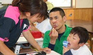 【 磨き残しのチェック!! 】     【 2人がかりで薬剤塗り 】