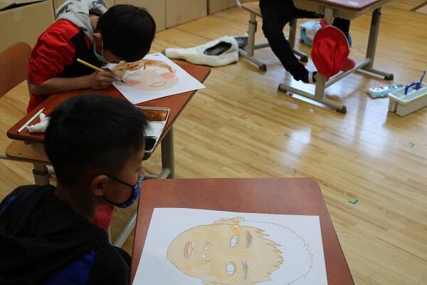 2年生の図工では、似顔絵を描いていました。