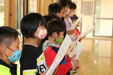 5月1日の尾向小学校との2校間集合学習に向けて、全校で学校紹介の練習をしました。