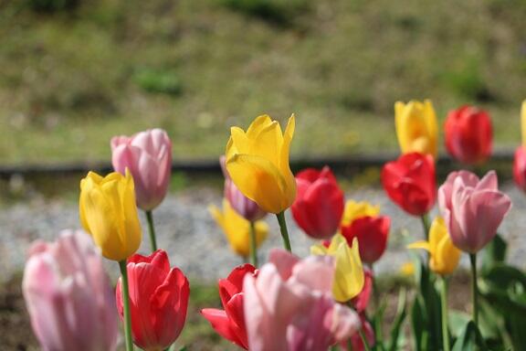 チューリップが色鮮やかな不土野小学校の花壇。