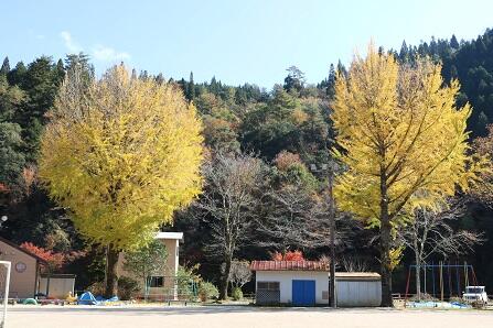 不土野小の名物の1つ、2本のイチョウの木はもう黄色くなって散り始めています。