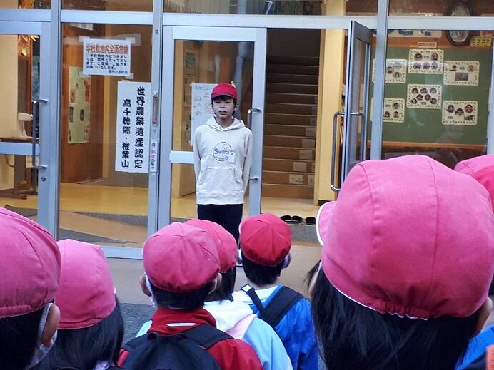 初めの会での児童あいさつです。不土野小6年生が大役を務めました。