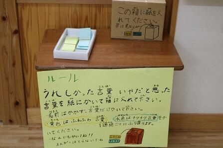 「うれしかったことば」「いやだったことば」をそれぞれ書いて、投函してもらいます。みんなで振り返って、言葉遣いについて考えようという5・6年生のアイデアです。