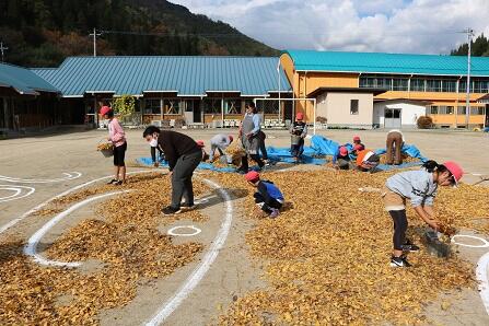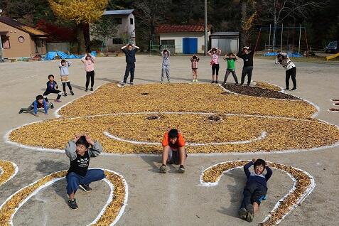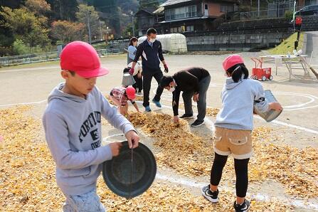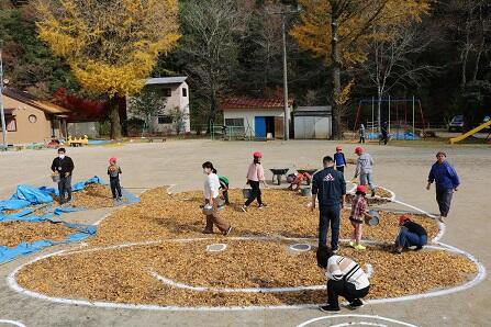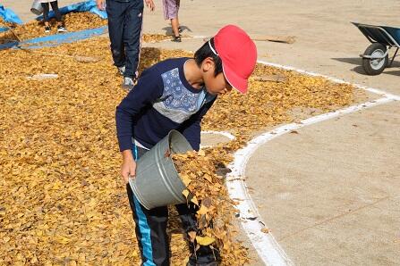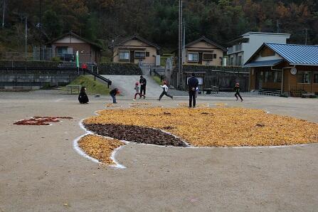 4時間目に6年生が運動場に描いた下絵に、イチョウの葉を敷き詰めます。
