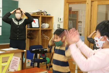 英語の歌を振り付けで歌ったり、世界のあいさつを学んだり、大盛り上がりの学習をしていました。
