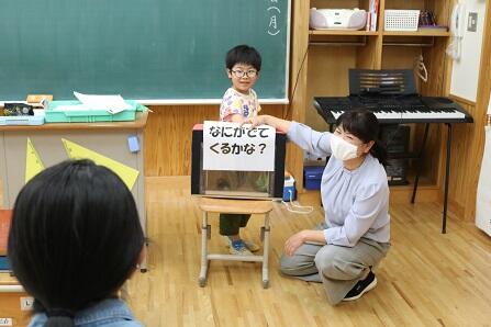 手触り・形で食材を当て、食べ物に興味をもたせます。