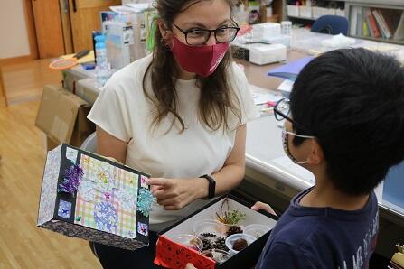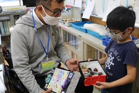 2時間目、1年生が素敵な作品を持って職員室に来ました。