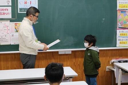 まずは、作文発表。持久走、一輪車など、2学期の自分の努力とその成果を3名の児童が堂々と発表しました。