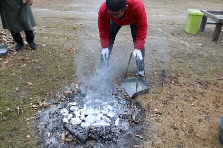 濡れたキッチンペーパーとアルミホイルをさつまいもに巻き、落ち葉を焼いた灰にすっぽり入れます。