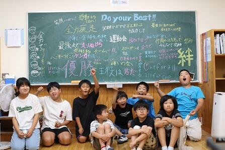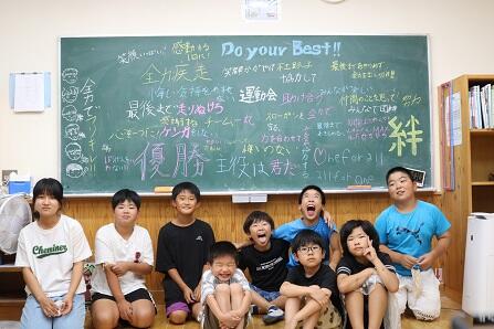 5・6年生が全校、先生方に呼びかけて運動会にがんばりたいこと、がんばってほしいことを一人一人黒板に書いていきました。完成したので、最後に記念撮影!!