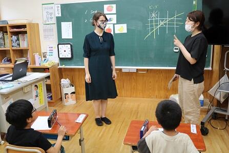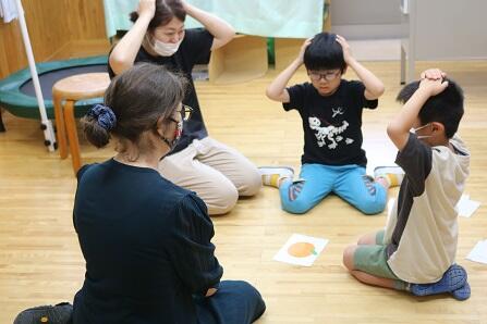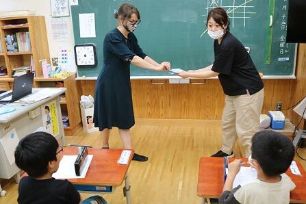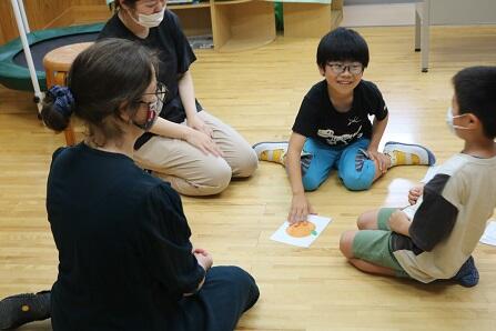 1・2年生がALTのジュリー先生と外国語でフルーツカルタをしていました。