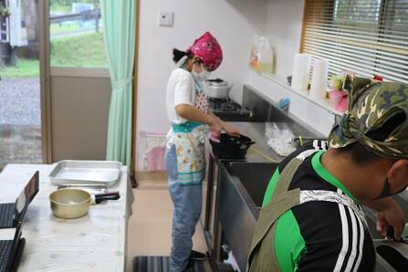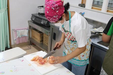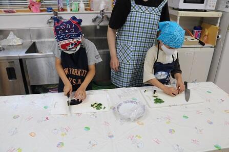 自分達が育てた野菜を切っています。ナスとインゲン豆です。
