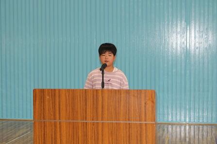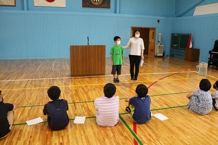 7月17日(日)に門川町で行われた「子ども落語大会県予選」小学生の部で勝ち残り7月30日(土)31日(日)に日向市で行われる全国大会出場を決めた児童の紹介をし、みんなで励ましの拍手をしました。