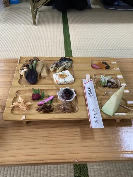 お昼ご飯は、「鶴富屋敷」で食べました。これに、ご飯とおそばも付いています。おいしかったです。ごちそうさまでした。鶴富屋敷のつくり等についてもお聞きすることができました。