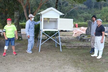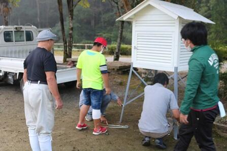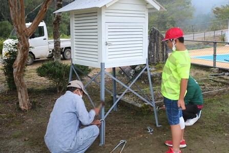 百葉箱の箱の部分を数人で持ち上げ、鉄製の脚にのせました。そして、脚を杭で固定しました。