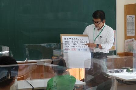 「運動会までの練習でたくさん失敗をして(皿を割って)、運動会までにずいぶん成長しましたね。」「挑戦し、失敗することで成長できる。」というお話でした。そして、「これからもたくさんの行事があり、たくさん挑戦することができるので、頑張ってください。」と締めくくられました。