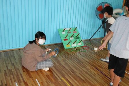 体育館では、輪投げの準備をしていました。入るところで点数がちがうようです。