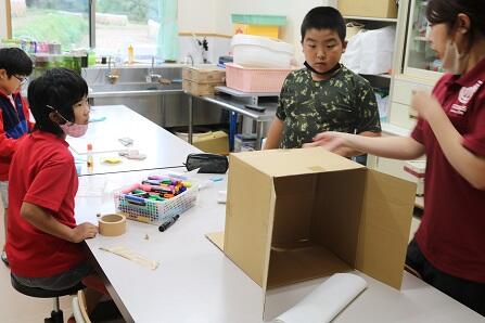 段ボールで何か作っています。本人に聞くと、ガチャだということで、回すと中から景品が出てくるようです。