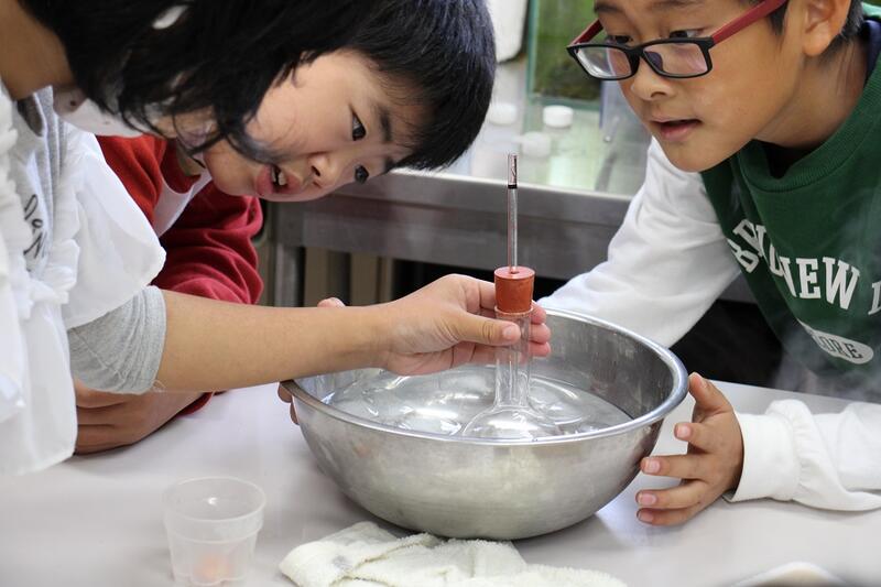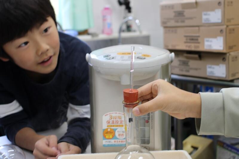 実験は大成功です(^^) お湯で丸底フラスコをあたためたらゼリーがガラス管の上へ動き、氷水で冷やしたらゼリーは下へ動きました。つまり、空気はあたためると体積が・・・冷やすと体積が・・・ということです。理科の実験は楽しいですね~