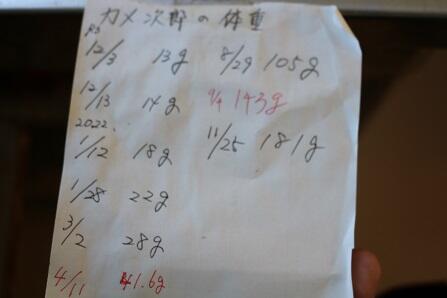 関係ないですが・・・カメ次郎の体重を久しぶりに・・・