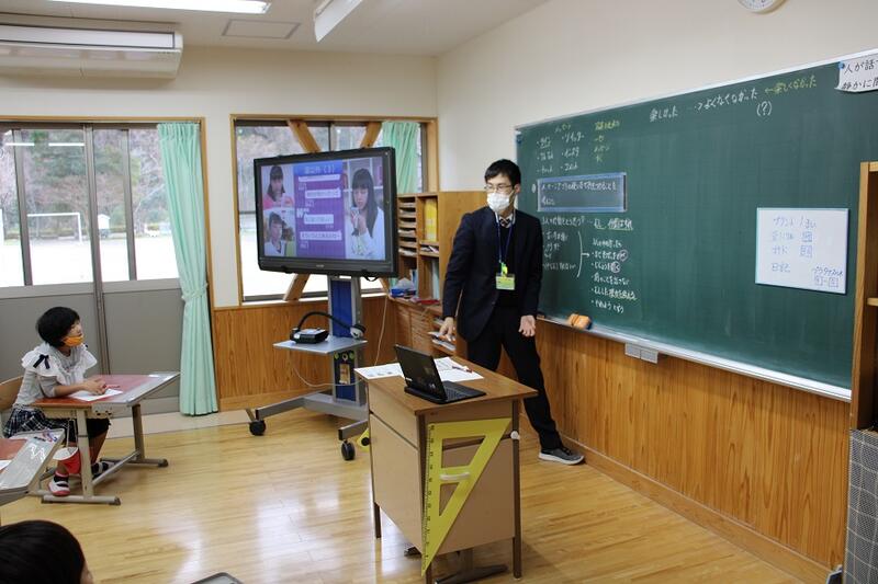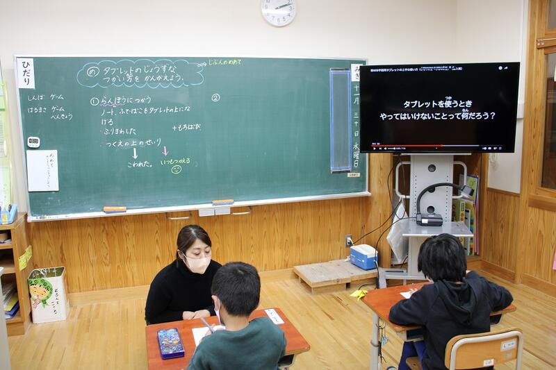 1・2年生です。1・2年生は、「タブレットを上手に使うために気をつけること」を話題にした授業を行いました。
