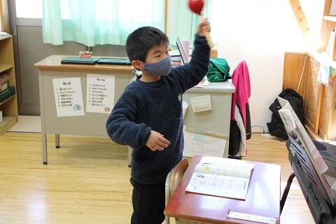 1年生は「前回し跳び」です。腕全体を回していたので、わきをしめて縄を回すように、わきに赤白帽をはさんで回させました。そのおかげかは分かりませんが、103回跳べました。これまでの記録の倍くらいだそうです。