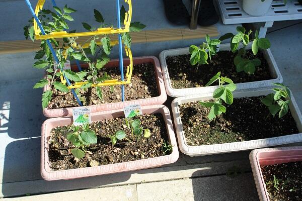 2年生が育てているミニトマト、オクラ、枝豆です。