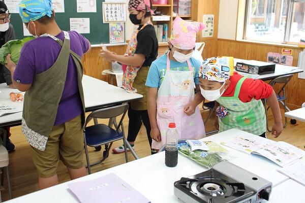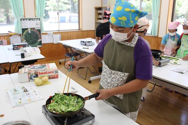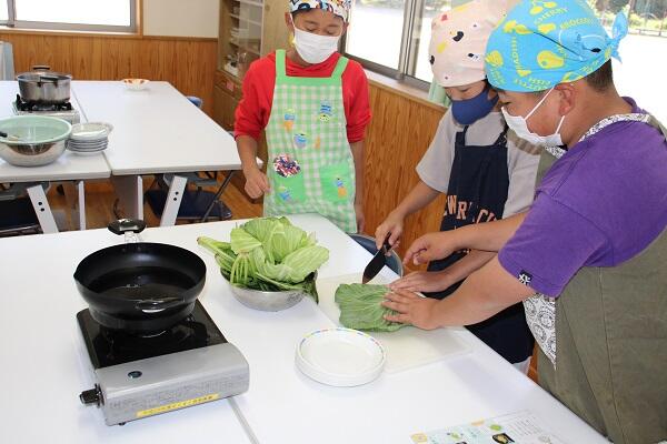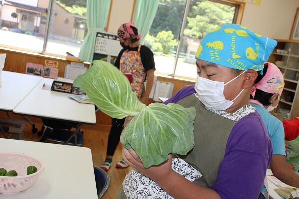 6年生が、5年生にキャベツの切り方を教えています。さすがですね~