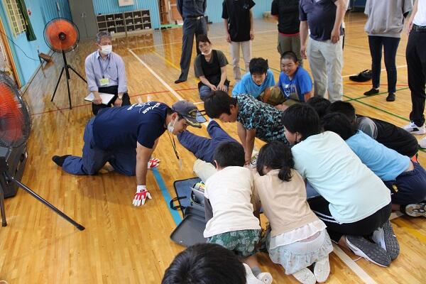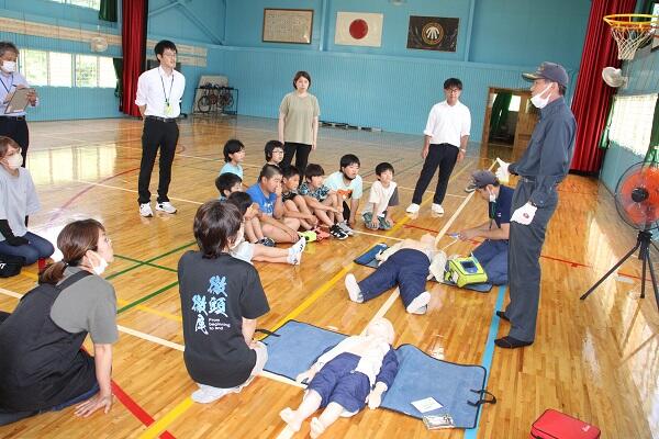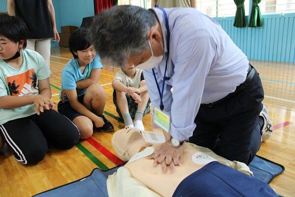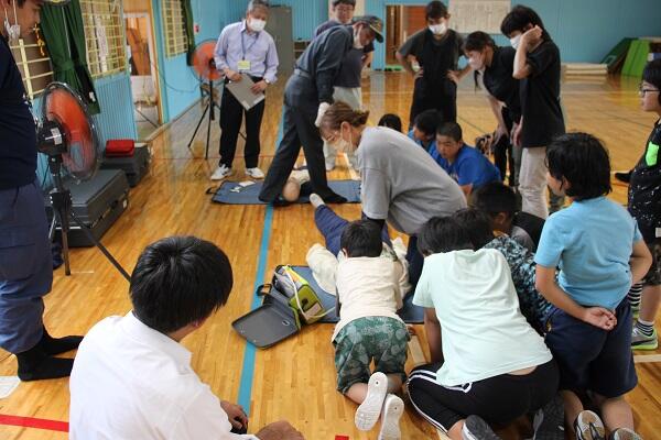 主に心臓マッサージの仕方を学び、実際に何度も練習しました。保護者、児童、職員みんな体験することができました。