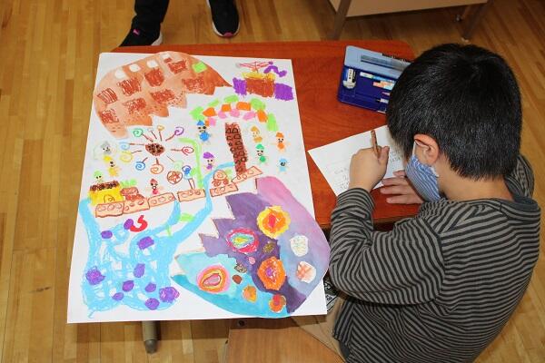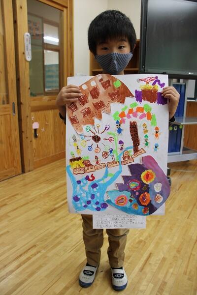 2年生も完成したようです!題名は、「おかしとこびとのせかい」だそうです。絵の中の一つ一つを説明してくれました。