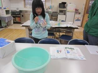 ミョウバンを混ぜて溶かしています。水の温度の違いでものの溶け方がどのように違うか実験をしています。