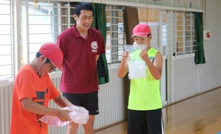 【 さあ、今から水袋を振ります! 】   【 何色になるのか?興味津々 】