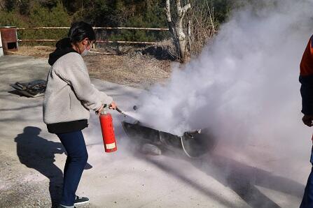 その後、消火器の使い方を教えていただき、高学年の児童も実際に消火の体験をしました。