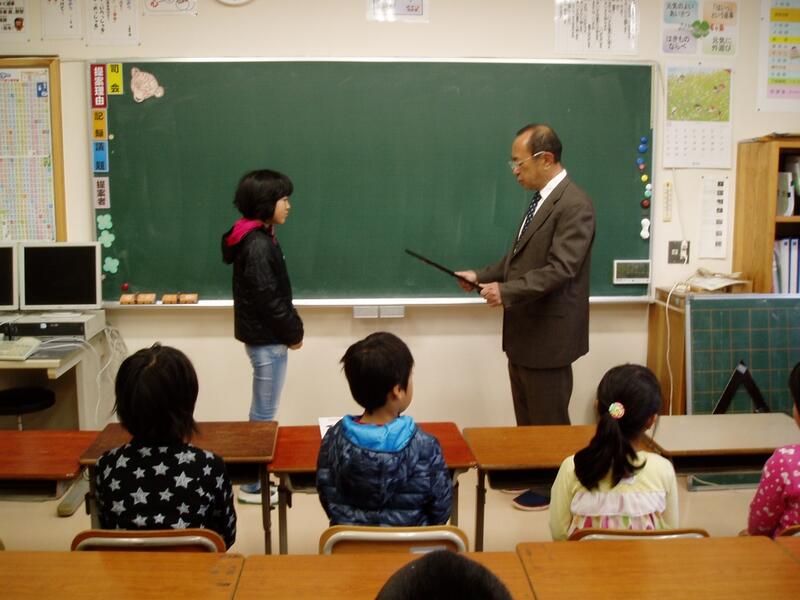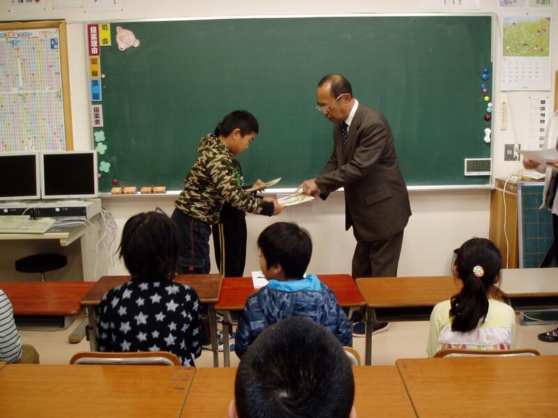 【産業祭で入賞した1・2年へ】   【 日向地区陸上大会の表彰 】