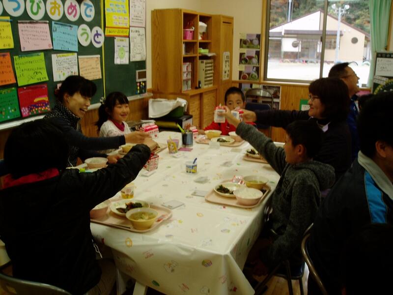 先生への質問・先生からの言葉があり、牛乳で乾杯した後、楽しく