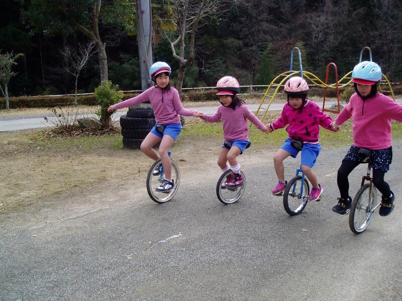 動場で一輪車に乗って、久しぶりの感触を楽しんでいました。