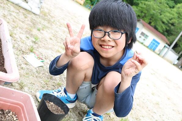 花の種を植えています。種は、ホウセンカとマリーゴールド、ヒマワリだそうです。