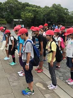 長崎市内に着いた子ども達は、平和記念公園の平和の像の前で黙とう