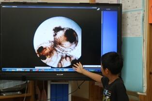 た。大型テレビ・パソコンを使って、調理実習の様子や5年生が育ててい
