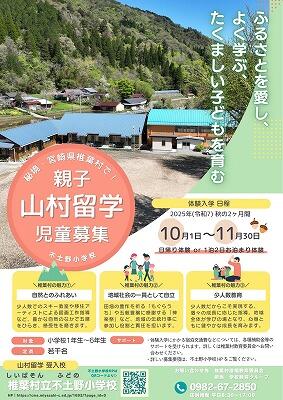 不土野小学校では、自然豊かな椎葉村の魅力を体験できる「親子山村留学」プログラムを実施します。地域の自然や文化とふれあいながら、子どもたちの成長を応援します。ぜひご参加ください。