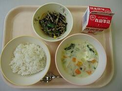 麦ご飯・さつまいものシチュー・ひじきとごぼうのサラダ