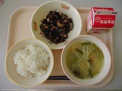 麦ご飯・じゃがいものみそ汁・大豆とひじきの炒め煮