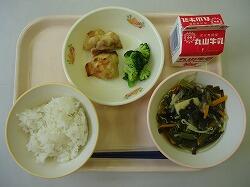麦ご飯・五目スープ・鶏の唐揚げ・ブロッコリー