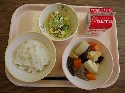 麦ご飯・鶏肉と大豆の煮物・千切り大根と小松菜のサラダ