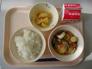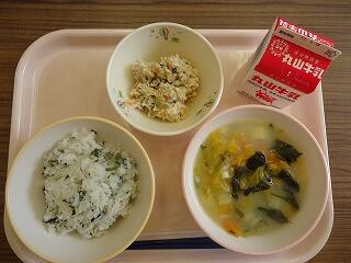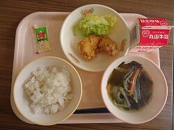麦ご飯・じゃがいものみそ汁・鶏のからあげ・ゆかりあえ