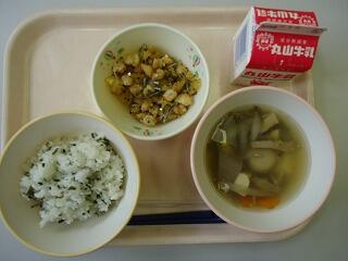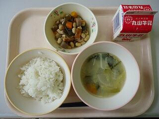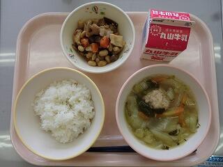 麦ご飯・ごぼう団子汁・大豆とひじきの炒め煮