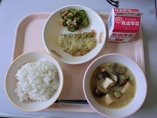 麦ご飯・秋野菜のみそ汁・ホキの天玉揚げ